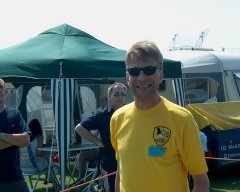Der schöne und gepflegte Platz liegt westlich Duisburg in der Nähe von Geldern. Legendär ist Treffen sicherlich aus zweierlei Gründen, so gab es diesesmal eine Sonderedition an T-Shirts mit Stickereien zum Selbstkostenpreis. Der Sticker hat leider nur "Kerken" mit Schumachers Kerpen verwechselt. Man möge es nachsehen, damals war Michael Schumacher der erfolgreichste Rennfahrer der Formel-1 Geschichte. Man nahms mit Humor :-) Fehldrucke bei Briefmarken sind Millionen wert und so hat der Webmaster auch heute noch sein Gelbkittel im Schrank ...