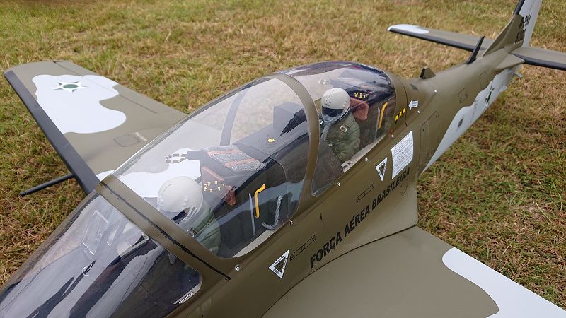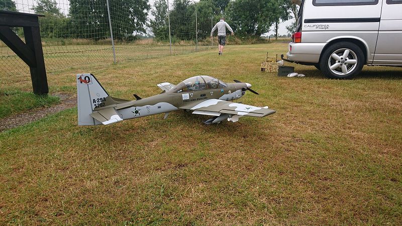 Eine EMB 314 Super Tucano im Maßstab 1/7! Hier schreitet Olli gerade zum "Maiden"........entspannt wie immer!